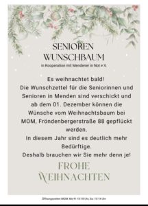 Auch in diesem Jahr wird es wieder einen Seniorenwunschbaum geben. Ab 1. Dezember steht der Baum mit den Wünschen bei MOM-Mendener Möbeloutlet an der Fröndenberger